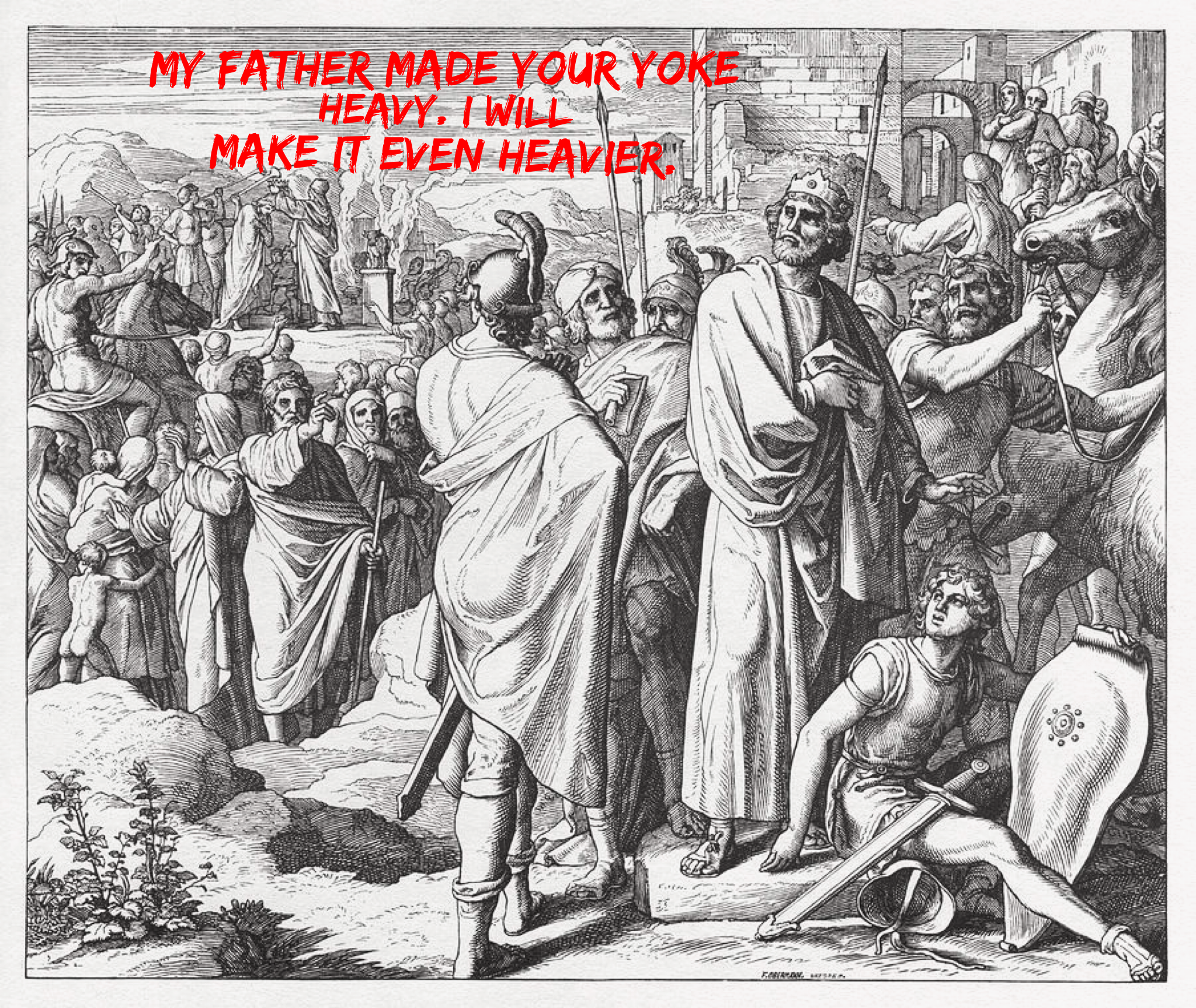 Rehoboam sends Jeroboam away so he can consult with the elders from his father’s day. They advise him to lighten the yoke for the sake of peace in the kingdom. But Rehoboam is not satisfied with this advice. So instead, he consults his friends, who advise him not only to not lighten the yoke, but to make it heavier – to assert his dominance – to show them who’s boss. So this is what Rehoboam foolishly does.